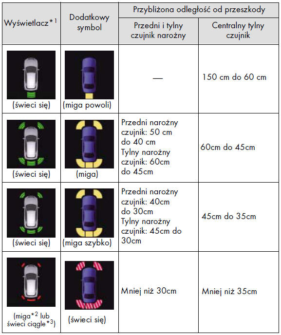 Wraz ze zbliżeniem się do przeszkody częstotliwość sygnałów akustycznych zwiększa się. Gdy odległość samochodu od przeszkody osiągnie poniższe wartości, rozlegnie się sygnał ciągły.